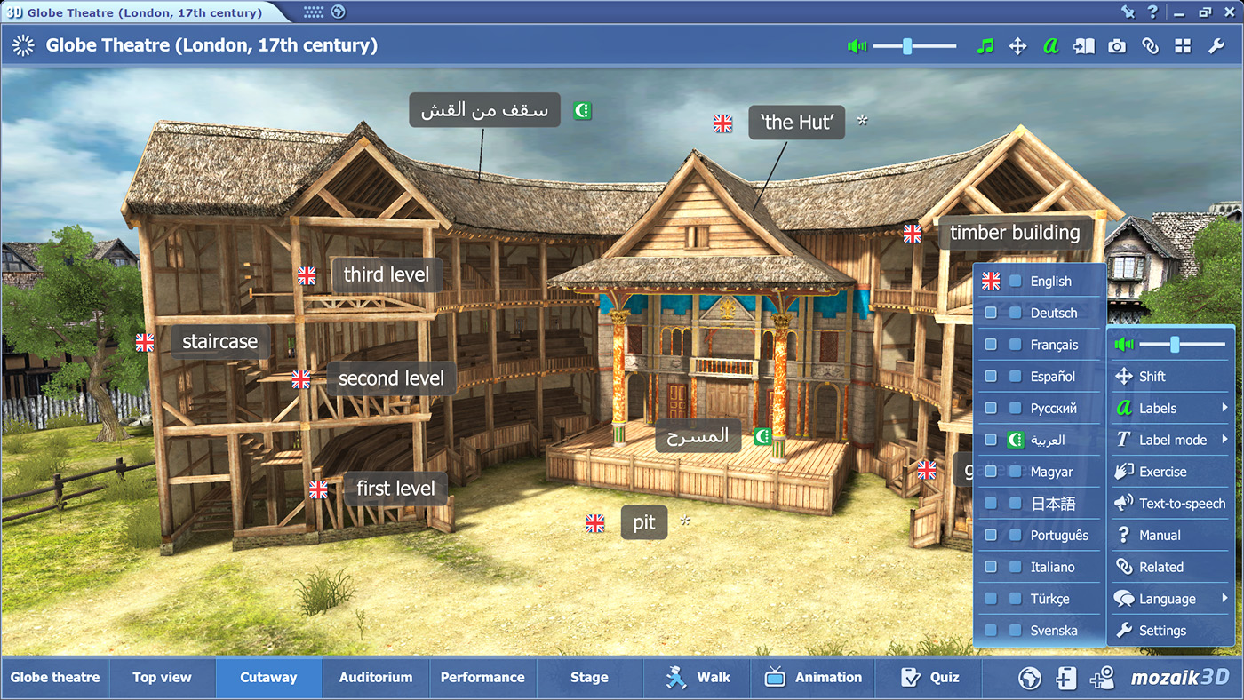 mozaBook is a powerful educational tool whether it is used for bilingual classrooms or to support the study of a foreign language. mozaBook is translated into 20 languages and the MULTILANG mozaBook license allows for the interchangeable usage of these languages. It is possible to switch the operational language at any point while running the software. mozaBook also contains educational tools that were specifically designed to help students learn foreign languages. For example, our Word finder and Lan(g)game tools are a fun way for students to learn new words, while our Spelling tool is a bottomless resource of spelling exercises to use in class. If these are still not enough, our 3D models can run in two languages simultaneously and become the center of attention in a bilingual classroom.