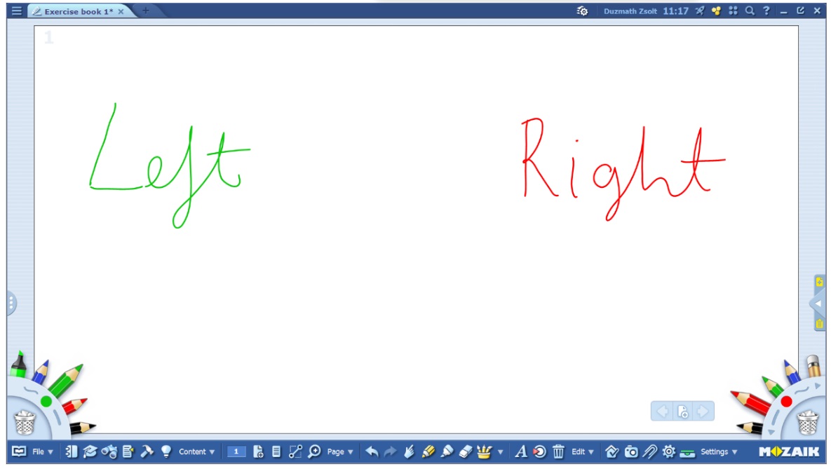 You can activate the 2-side drawing function by long- pressing the pencil case located on the lower corner of the mozaBook screen. By activating it, the page will be divided into two sides right in the middle and two students can work on exercises simultaneously on both sides. In case of a vertical workbook, the border between two pages is the dividing line.