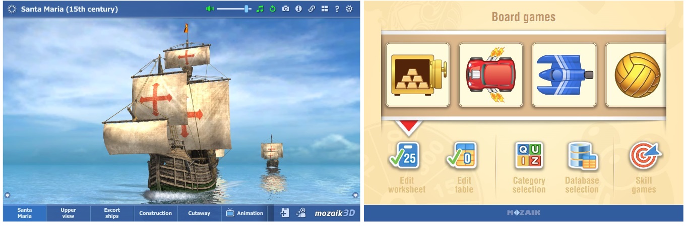 Some of our 3Ds already have a built-in database of board quiz questions. Simply open a 3D scene which has a board game function (for example Santa Maria) and click on the ‘create board game’ menu. Multiple 3Ds can be used to create the database of one board game (seen in ‘Edit worksheet’).