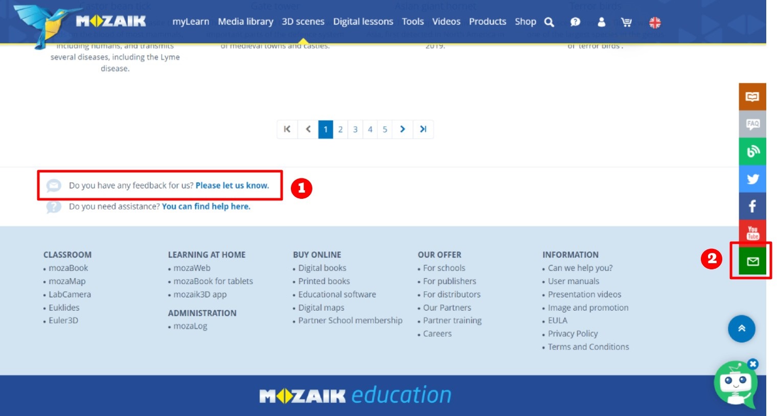mozaWeb users can access the feedback form either by using the Feedback link offered on every page just above the footer (1) or by clicking on the green envelope icon (2), which is the bottom-most one on the right-side floating menu.