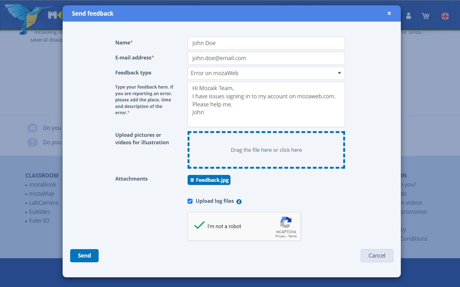 mozaBook users have always had the Feedback function available as part of the Help section for sending reports on technical issues they might experience while using the product. Now this option for sending feedback to our developer teams is also made available on mozaWeb. We primarily expect our users to send reports on mozaWeb bugs or technical issues here, however, you can also praise our developer team if you find something very useful and send proposals to our editor team to consider creating new content on a topic that is not yet covered.