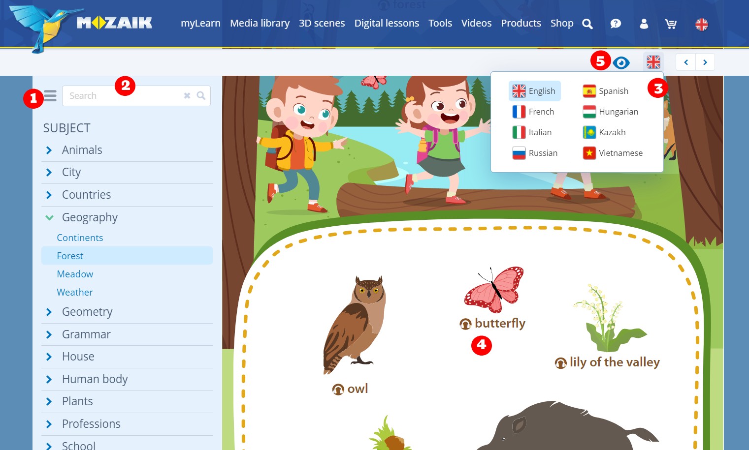 - Select the language of the Picture dictionary by clicking on the top-right flag. At this moment the list of available languages is English, French, Italian, Russian, Spanish, Hungarian, Kazakh and Vietnamese. We are continuously extending the list of languages in the dictionary. Please note that the language selected here will not have any impact on the selected mozaweb.com language that is used for browsing the portal.