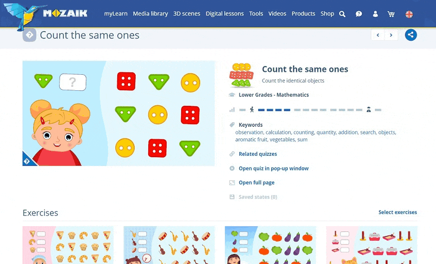 On the myLearn page students will be offered relevant quizzes according to their grade (if set in the user profile) in a random manner. These short and engaging exercises help them achieve a quick feeling of success, making learning real fun. Also, quizzes - just like other interactive items from the Media library - can be added/pinned to any exercise book while being created or edited in mozaBook.