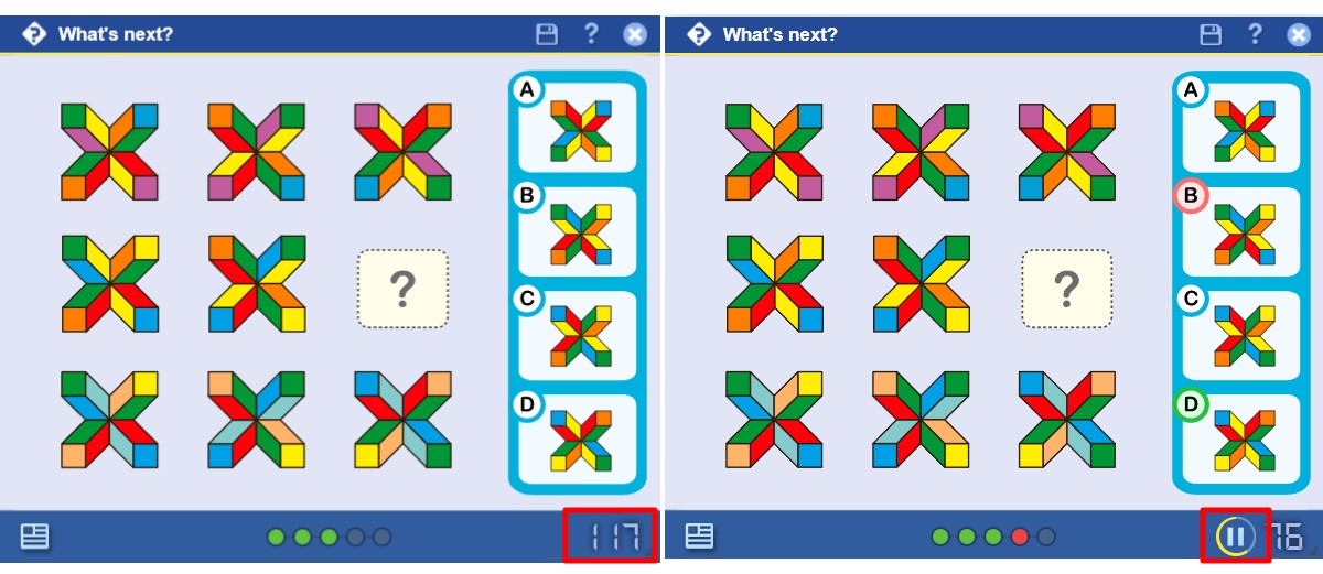 - Timer: Quizzes come with a limited time for the student to solve them The countdown in the bottom right corner of any Quiz indicates the remaining time to solve the exercise. The amount of time available for a given quiz depends on the difficulty level and is set by the system automatically. As soon as one of the answer options are marked, the quiz will indicate if the answer was correct (green) or not (red). Users may sometimes need more than just a few seconds to analyze the correct solution before the quiz timer would automatically offer the next exercise from the same category. To suspend the auto-forward function, users should simply click on the pause icon and then can take the time necessary to review and discuss the answers.