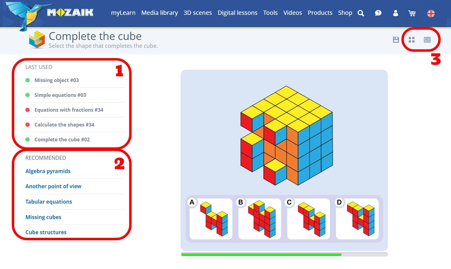 - Below that, still on the left side, mozaWeb recommends a series of other quizzes based on the usage history of the user. This can be very helpful and effective in guiding the student to the next step once they feel like trying something else.