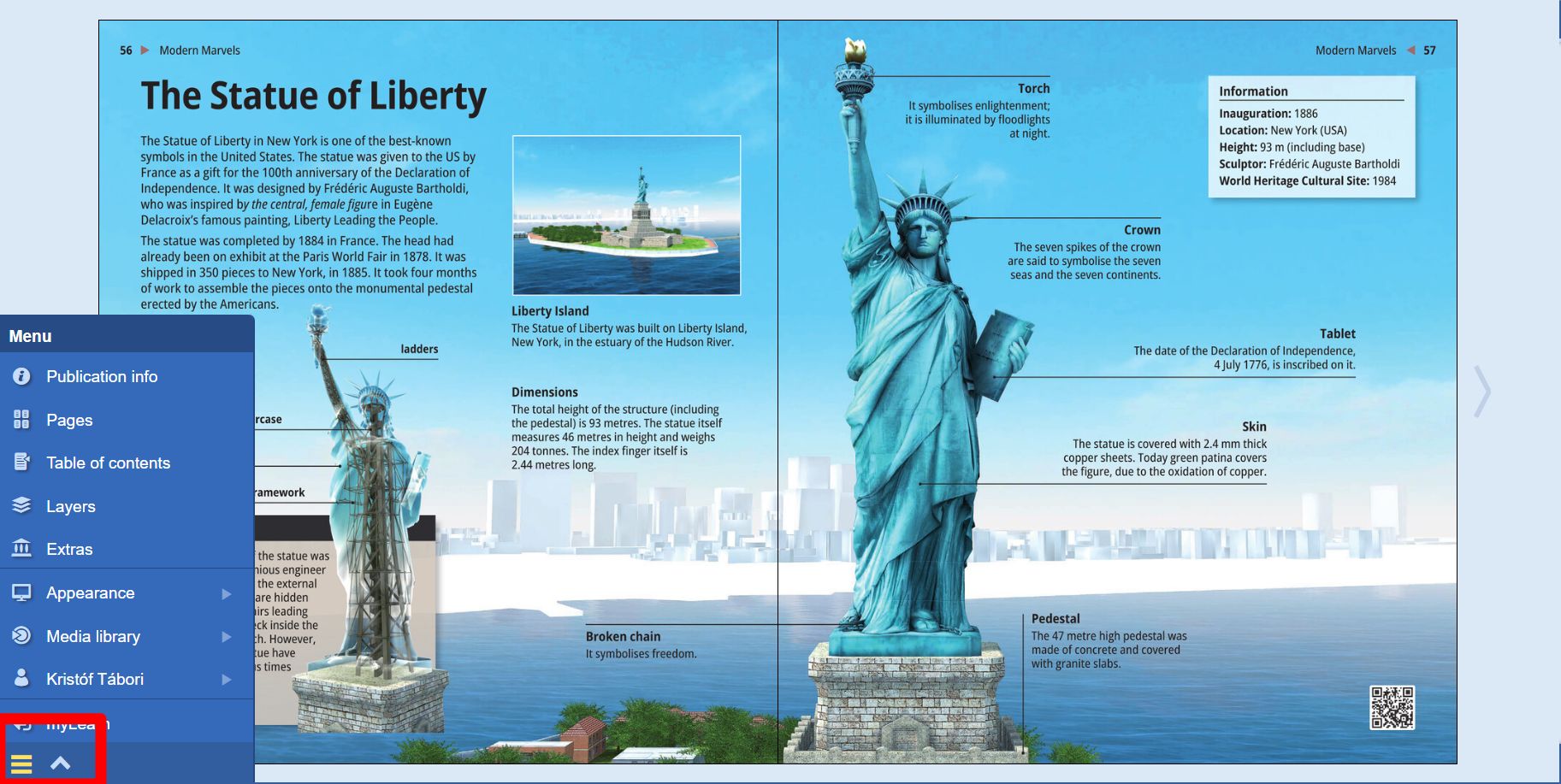 By clicking on the hamburger menu in the bottom left corner users can choose from different options related to the material that they are projecting on the active tab, such as a list of included interactive extra contents and layers.