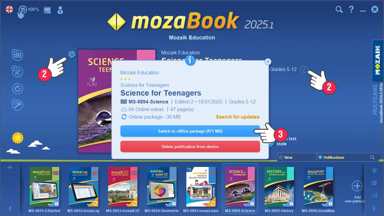 mozaBook дээр манай номнуудыг онлайн, бас офлайн хэлбэрээр ч гэсэн татаж авах боломжтой (1). Офлайн хувилбар нь үргэлж хард дискийн зайг арай ихийг шаарддаг, гэхдээ номуудыг татаж авсны дараа интернэт холболтгүйгээр ч бас нээж, дотор нь агуулагдах интерактив агуулгыг үзэх боломжтой байдаг (3D үзэгдлүүд, видео, дасгалууд).