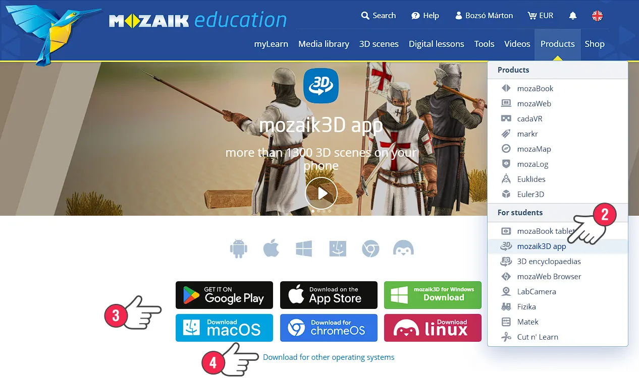 If no such message has been displayed, click on Products => mozaik3D app (2) to download the installer (3) corresponding to your system. Besides the most popular platforms, you can download the installer for other operating systems as well, for example, Android interactive boards (4).