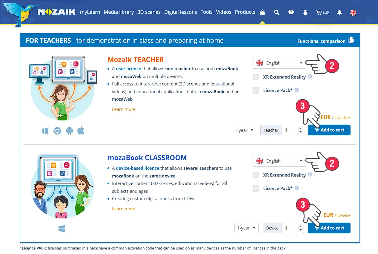mozaBook-ийн мэдээллийн хуудсан дээрээс хэд хэдэн төрлийн лицензээс сонгож авах боломжтой. Аль лиценз нь ямар боломж олгодог талаар уншиж үзээд, өөрт тохирохыг сонгоорой. Сонгосон лиценз дээрээ програмыг аль хэл дээр ашиглахаа тохируулаад (2), сагсанд хийгээрэй (3). Лицензүүдийн талаар эндээс дэлгэрэнгүй уншаарай.