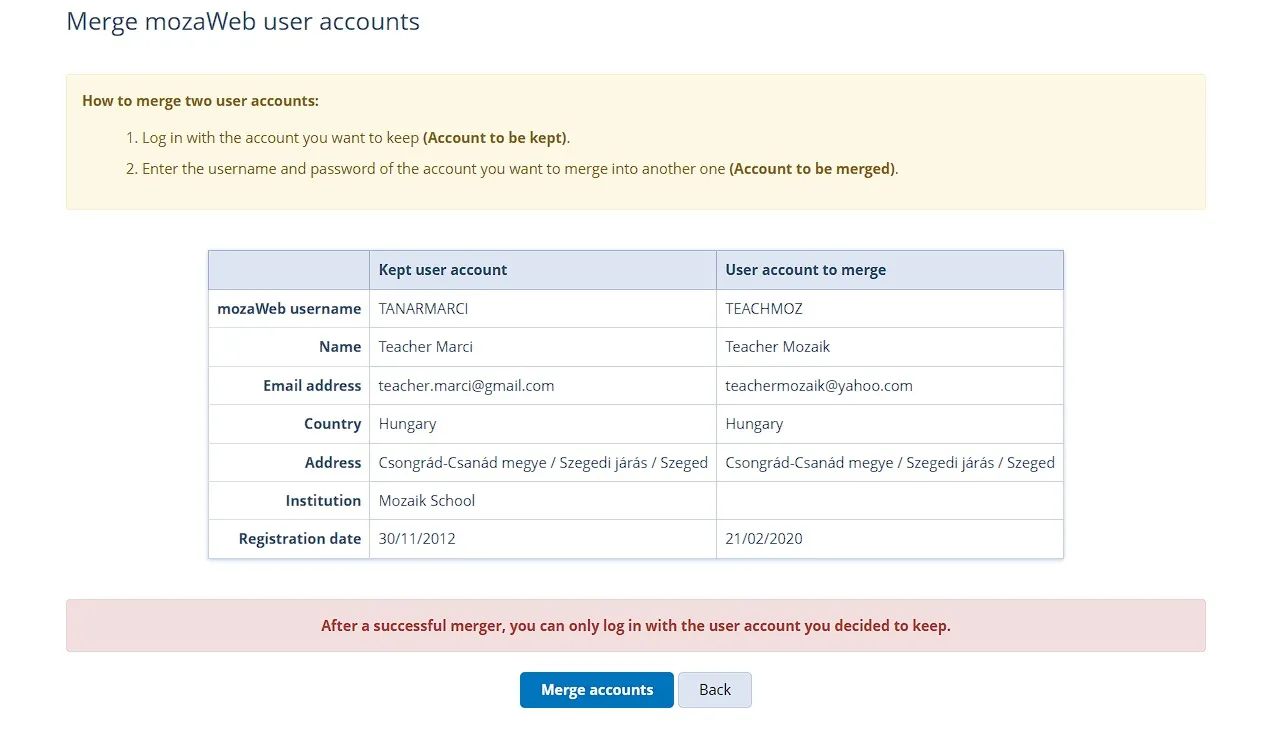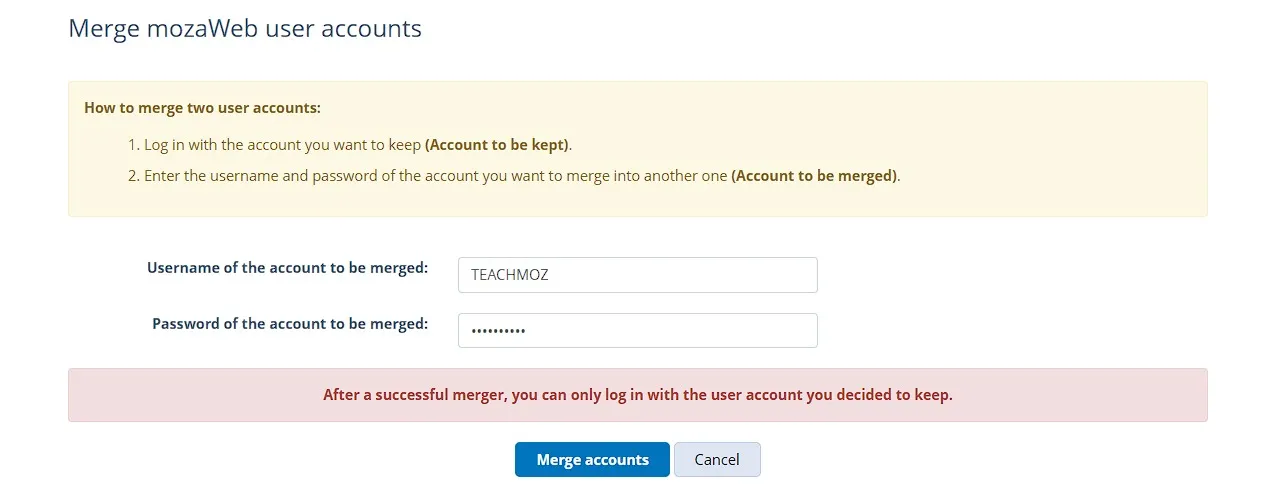 Гарч ирэх хуудсанд нэгтгэхийг хүссэн (буюу хаахыг хүссэн) бүртгэлийнхээ мэдээллүүдийг (хэрэглэгчийн нэр эсвэл имэйл хаяг, нууц үг) бичээд, Бүртгэлүүдийн нэгтгэх товч дээр дараарай.
