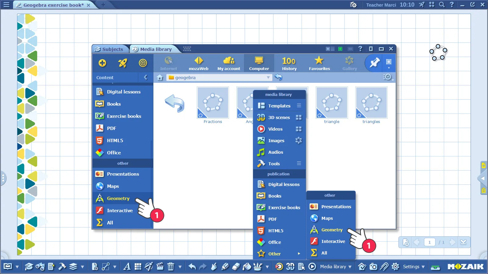 mozaBook дээр GeoGebra агуулгуудыг ч бас нээх боломжтой. Хадгалагдсан GeoGebra файлуудын өргөтгөл нь .ggb байдаг, эдгээр файлуудыг Медиа сангаас, Геометр цэснээс олж болно (1).