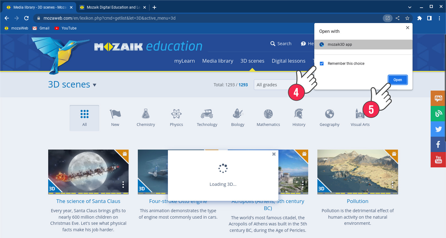 mozaik3D апп-ыг амжилттай суулгасан бол ямар нэг 3D үзэгдэл дээр дараад, веб хөтчид гарч ирэх мессежийг check-лээд (4) Нээх товч дээр дараарай (5). Ингэснээр дараачийн 3D үзэгдэл ганц товшилтоор шууд нээгдэх болно.