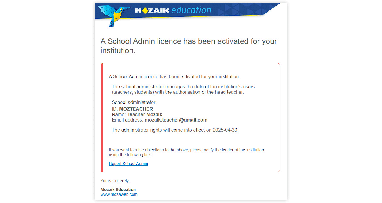 Худалдаж авсан School Admin лицензийг идэвхжүүлэх үед аюулгүй байдлын улмаас тус сургуулийн бүх хэрэглэгчийн (багш, сурагчид) бүртгүүлсэн имэйл хаягруу имэйлээр мэдэгдэл илгээн, уг лицензийг идэвхжүүлсэн хүн нь тэдний мэдээллийг School Admin эрх бүхий хэрэглэгчийн хувьд удирдах болсон талаар мэдэгдэх болно. Үүний зэрэгцээ уг мэдэгдэлд идэвхжүүлсэн хүний нэр, mozaWeb бүртгэл болон бүртгэгдсэн имэйл хаяг нь ч бас дурдэгдах болно.