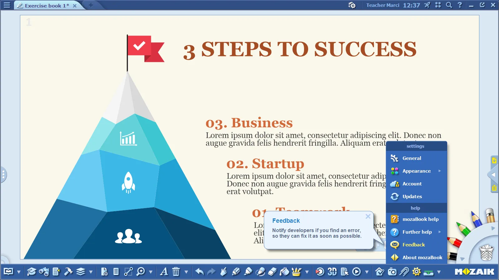 Хэрвээ та mozaBook дээр ямар нэгэн техникийн асуудалтай тулгарсан, ажиллах явцад алдаа гарсан, эсвэл mozaBook-ийн хэрэглээтэй холбогдолтойгоор хэлэх зүйл байвал тэр дор нь бидэнд санал хүсэлтээ илгээж болно. Ингэснээр манай хөгжүүлэгч багийнхан дотоод алдааны кодыг харан үр дүнтэйгээр тусламж үзүүлэх боломжтой болно. Үүний тулд цэснээс араа иконыг сонгоод, Санал хүсэлт хэсэг дээр дараарай.
