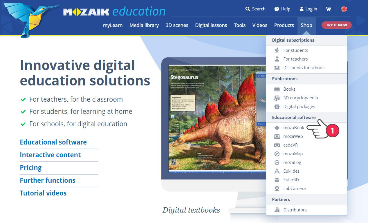 Татаж авахын тулд та mozaWeb бүртгэлтэй байх хэрэгтэй. Нэвтэрч орсны дараа толгой хэсгээс "е-дэлгүүр" цэсийг сонгон, гарч ирэх дэд цэснээс "mozaBook"-ийг дараарай (1):