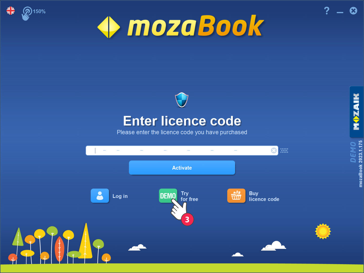Татаж авсан суулгагч програмыг эхлүүлээд зааврыг дагаарай. Суулгасны дараа mozaBook програмыг эхлүүлээрэй. Хэрвээ танд mozaBook CLASSROOM / mozaBook SCHOOL-LAB эсвэл Mozaik STUDENT / Mozaik TEACHER лиценз хараахан байхгүй бол демо горимыг сонгоорой (3):