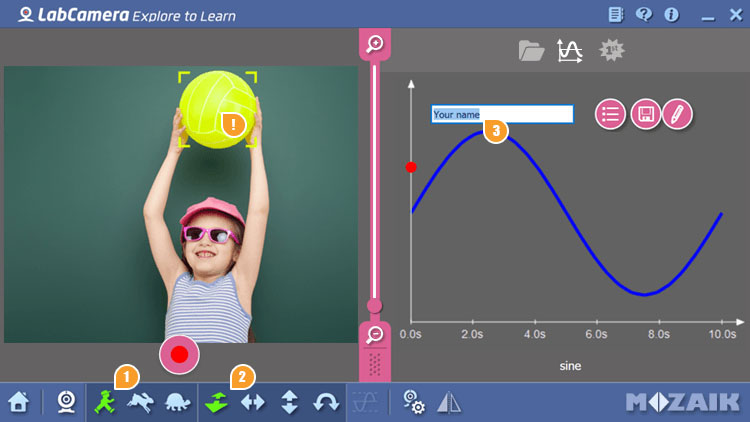 The Kinematics function allows tracking of the horizontal and vertical movement characteristics (displacement, velocity, and acceleration) of one or more objects in real time. The software is capable to capture a maximum of 3 selected objects at the same time, allowing complex kinematic experiments.