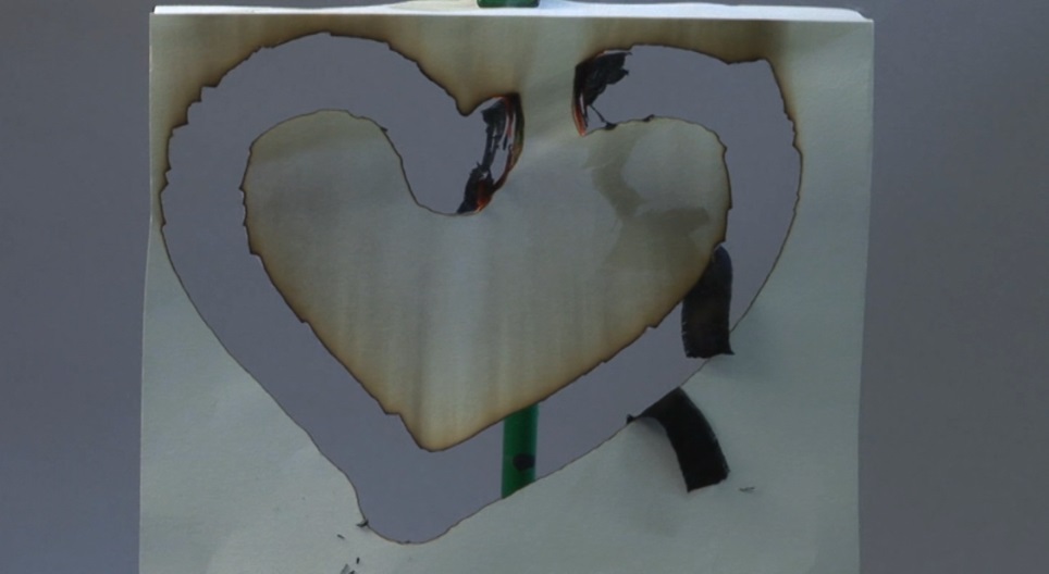Бид калийн нитратын уусмалын задралаар үүссэн хүчилтөрөгчийн тусламжтайгаар цаасан дээр зүрхийг шатаана.