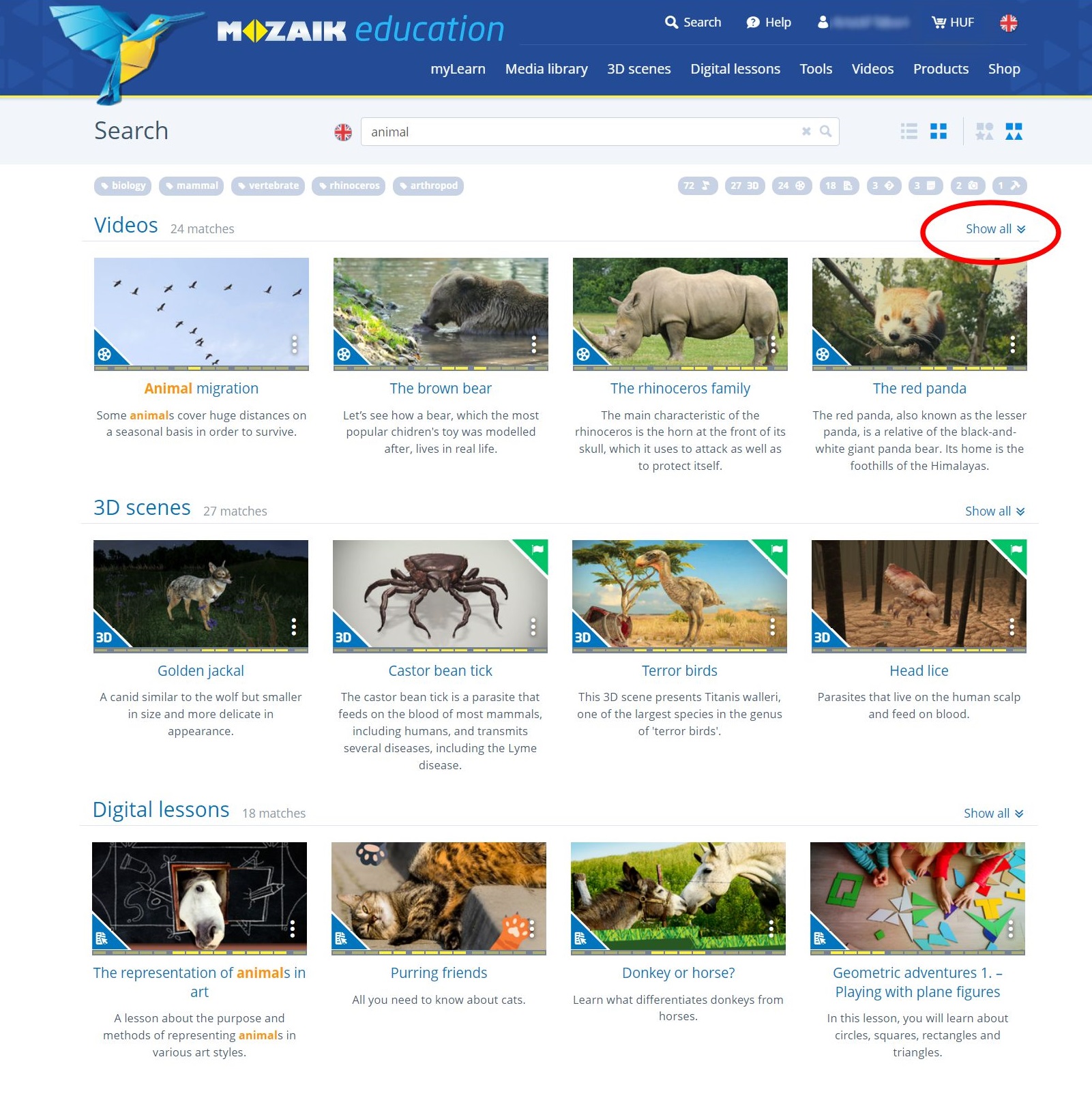 To pre-filter available content in the given category, users can adjust and narrow their search criteria down for grades, as an optional first step. By using the free text search field, mozaWeb will first list relevant search results that belong to the content category of the given page and then in further sections it will also make suggestions for relevant content in other media categories. For example, searching on the video page will list results for video content first and then suggest 3Ds, Digital Lessons and further items also related to the search criteria. Users can open the full list of matching items per category by clicking on ‘Show all’ in the category section’s header.