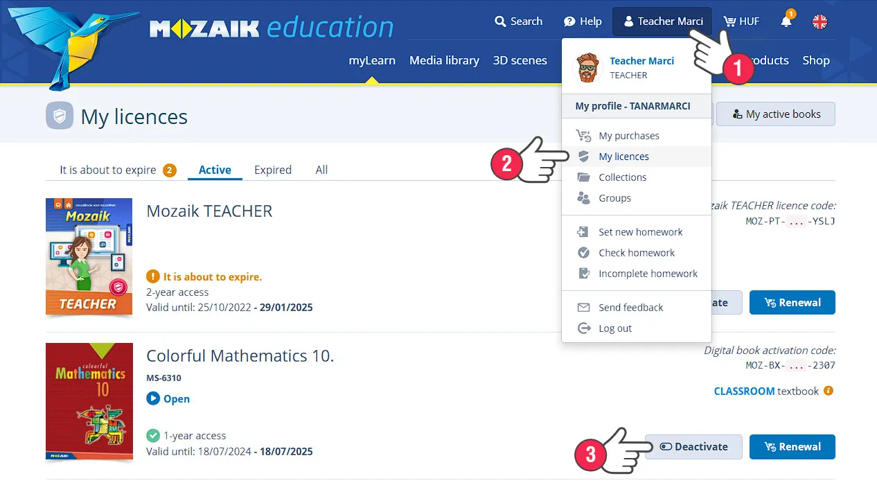 Хэрэглэгчийн бүртгэлд холбосон лицензүүдийн идэвхжүүлэлтийг нэг долоо хоногийн дотор цуцлах боломжтой байдаг, үүнд Mozaik TEACHER / Mozaik STUDENT, болон цахим сурах бичгүүд ба цахим атласуудын лиценз кодууд багтана.