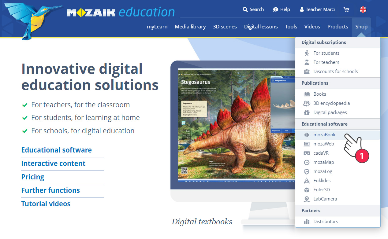 To buy a licence, choose Shop / mozaBook on the page header (1).