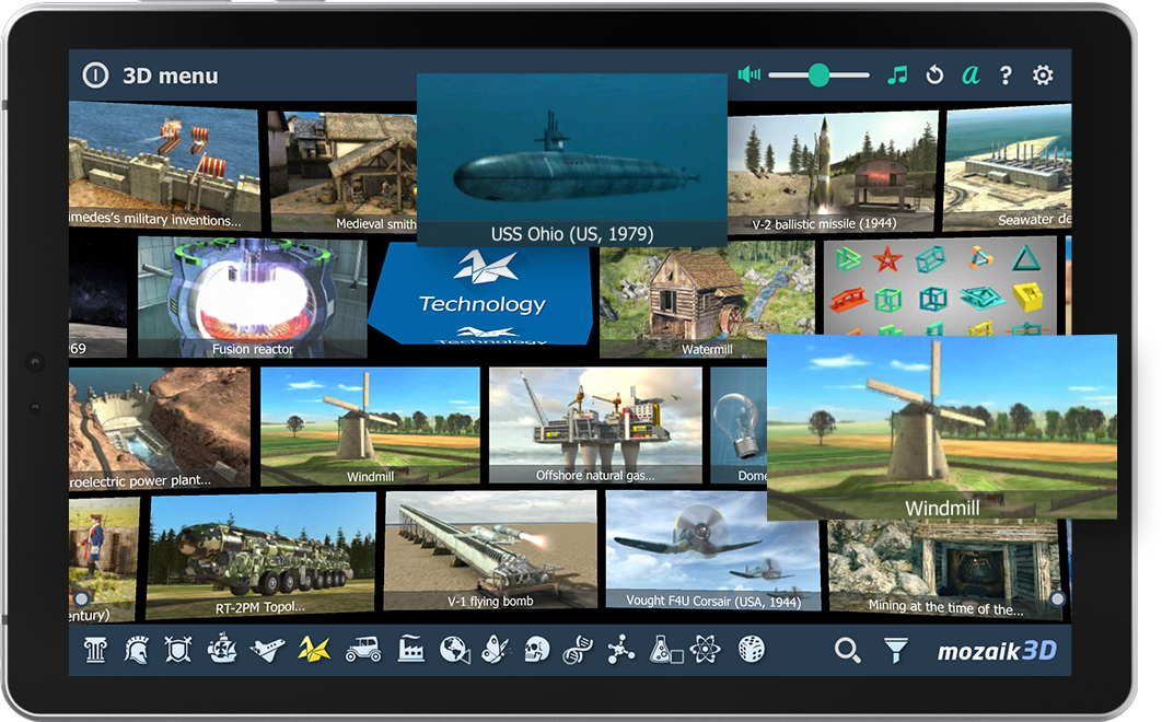 Mozaik’s vast interactive media library covers K-12 education and all the subjects. The interactive smartbook series presents a variety of topics in a compelling and easily digestible format with 3D scenes. These scenes allow students to not only observe but to interact with complex models of artifacts and scientific constructions otherwise accessible only by text or flat images. Students both observe scientific theory in action, and interact by pausing, zooming, shifting perspectives, and even triggering effects - making learning truly interactive.
