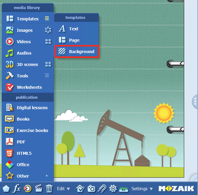 Easy access to Background settings from >templates< within the Media Library in mozaBook