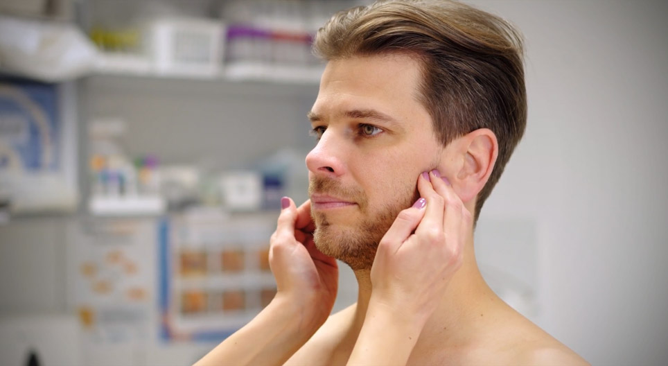 Inspecting and palpating the lymph nodes in the head and neck area, in the chest and axilla, and in the inguinal area.
